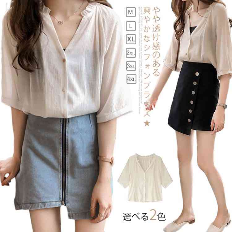 送料無料 ブラウス レディース シフォンブラウス シャツブラウス 五分袖 スキッパーシャツ Vネック 透かしブラウス 無地ブラウス キレイめ こなれ感 フェミニン こなれ感 トップス プルオーバー 春物 夏物 春新作