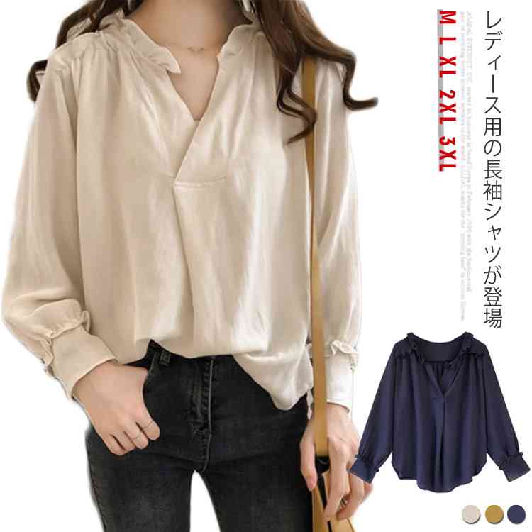 ブラウス レディース シャツ 長袖 ゆったり フリルブラウス レトロ 女性用 トップス 長袖ブラウス Vネック オシャレ キュート