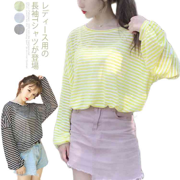 長袖Tシャツ 透明 レディース ブラウス 長袖 薄手 ボーダー柄 爽やか スケスケ ゆったり 女性用 トップス カットソー オシャレ レトロ