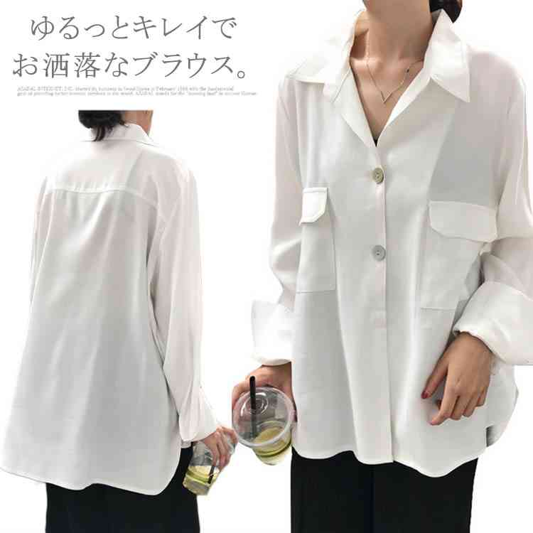 シャツ ブラウス レディース トップス 長袖 ゆったり 春 ポケット付き ホワイト お洒落 シンプル 無地