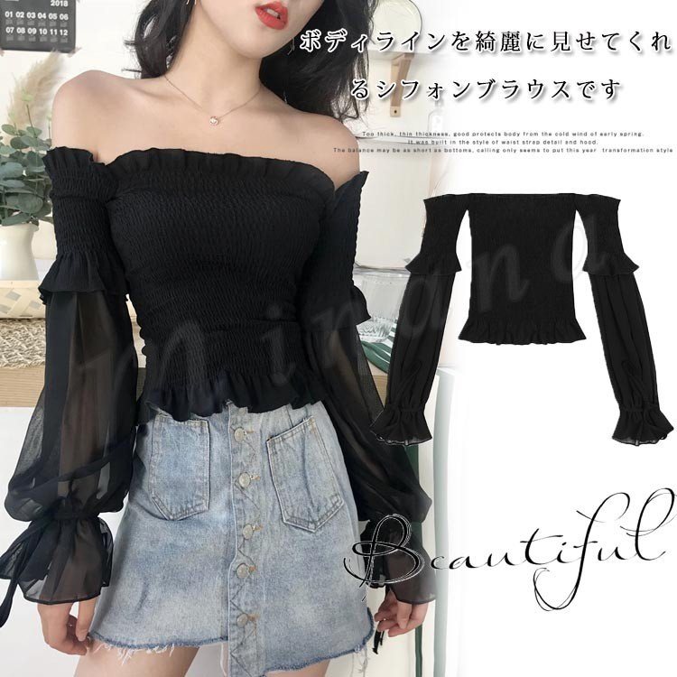 オフショルダーブラウス シフォンブラウス ギャザー レディース チュール フレア袖 長袖 トップス ボートネック フリル付き