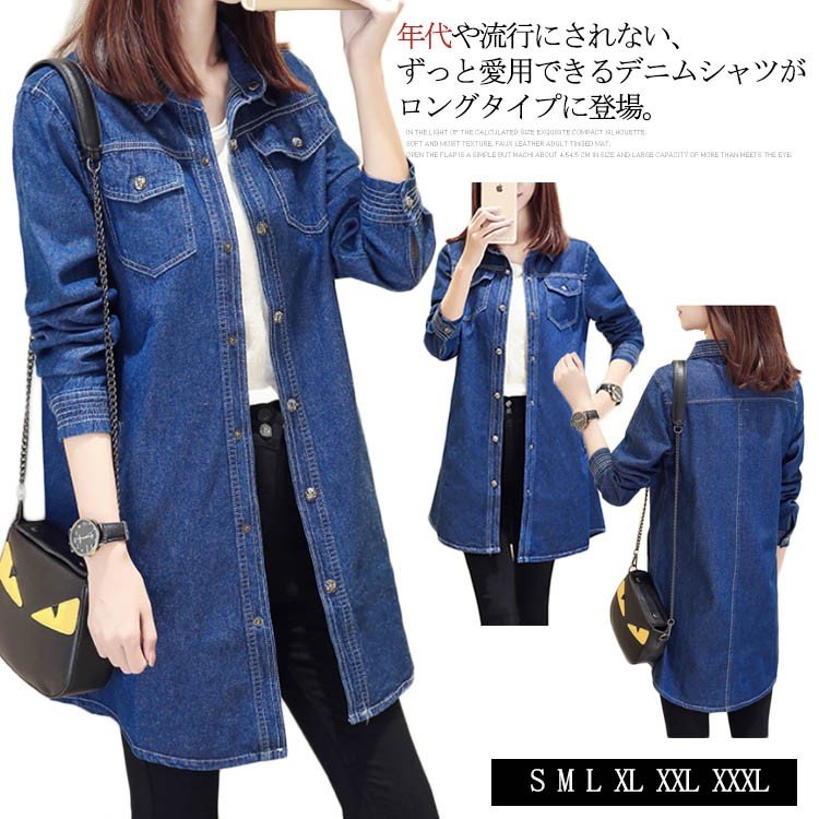 S-3XLサイズ!ロングデニムシャツ デニムシャツ ロング丈 デニム ロングシャツ 長袖 大きサイズ カジュアル 羽織物 春 秋 ネービー ゆったり 可愛い