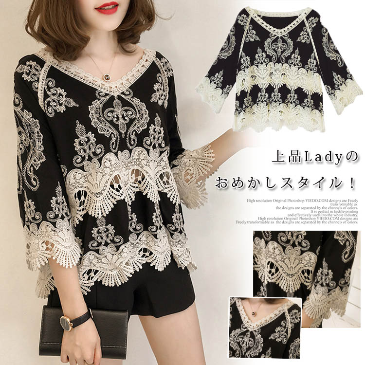 レース ブラウス 7分袖 刺繍 ブラウス フレア袖