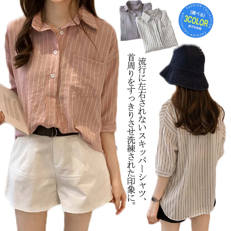 7分袖 シャツ ストライブ柄 スキッパーシャツ レディース ストライブ柄 シャツ ブラウス スキッパー シャツ チュニック 長袖 通勤 フェミニン オフィス