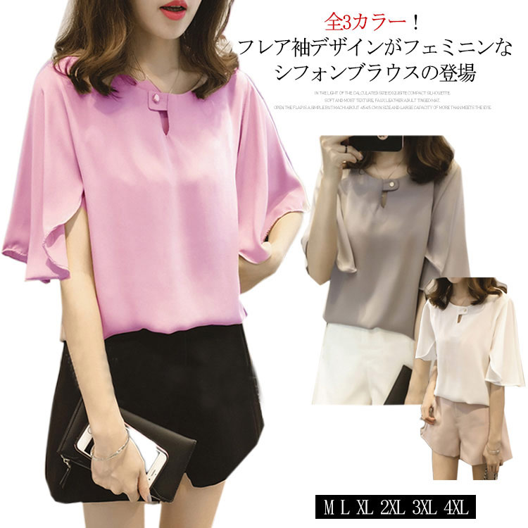 フレアスリーブ シフォンブラウス レデイース とろみシャツ シャツブラウス トップス 大きいサイズ フレア袖 無地 フォーマル 夏物 5分袖 クルーネ