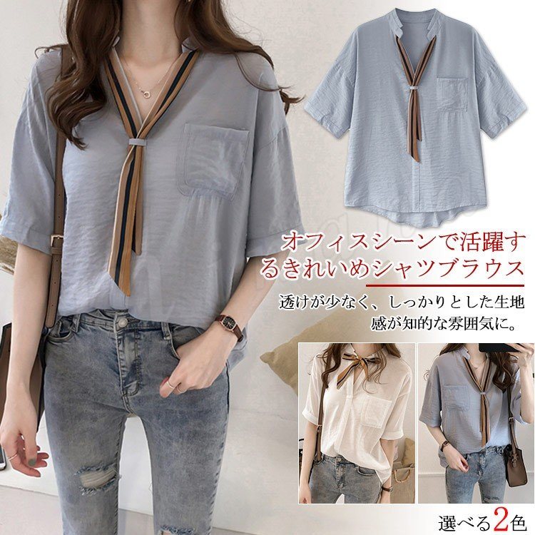 ブラウス レディース とろみシャツ ネクタイ 5分袖 Vネック オフィス ストライプ オフィス ビジネスシャツ 20代 30代