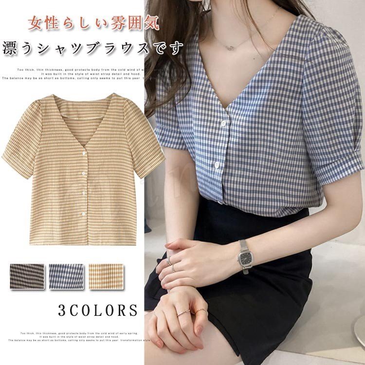 シャツブラウス Vネック チェック柄 半袖 レディース トップス チュニック フェミニン エレガント 通勤 スタイリッシュ OL 新作