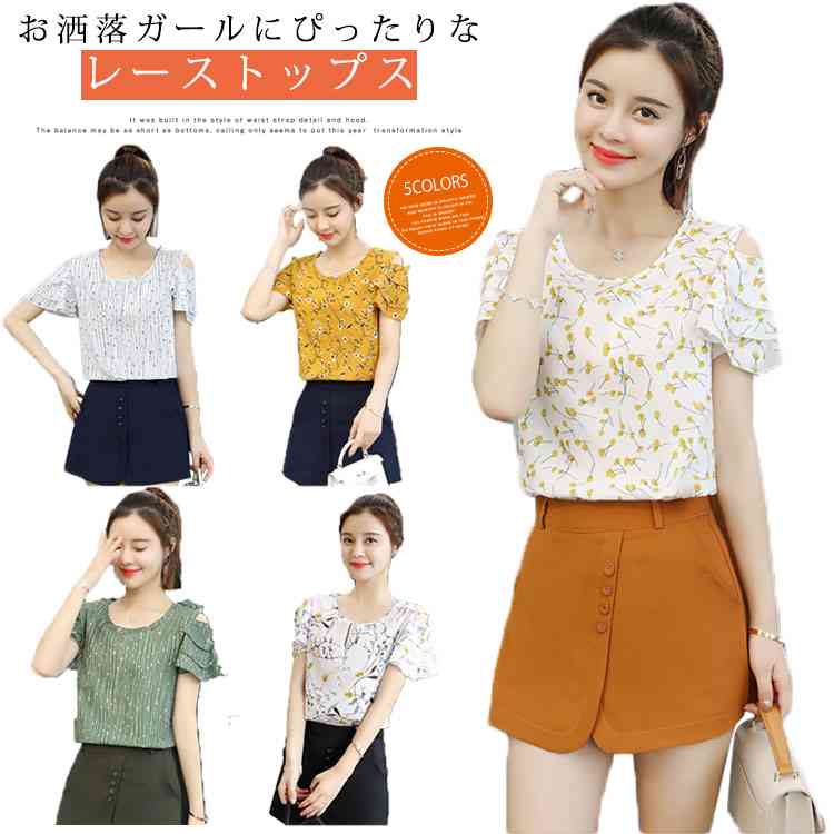 肩あきトップス 肩出し シフォンブラウス レディース シャツ ブラウス 半袖 花柄ブラウス フリル トップス シフォン 花柄 肩あき オフショルダー
