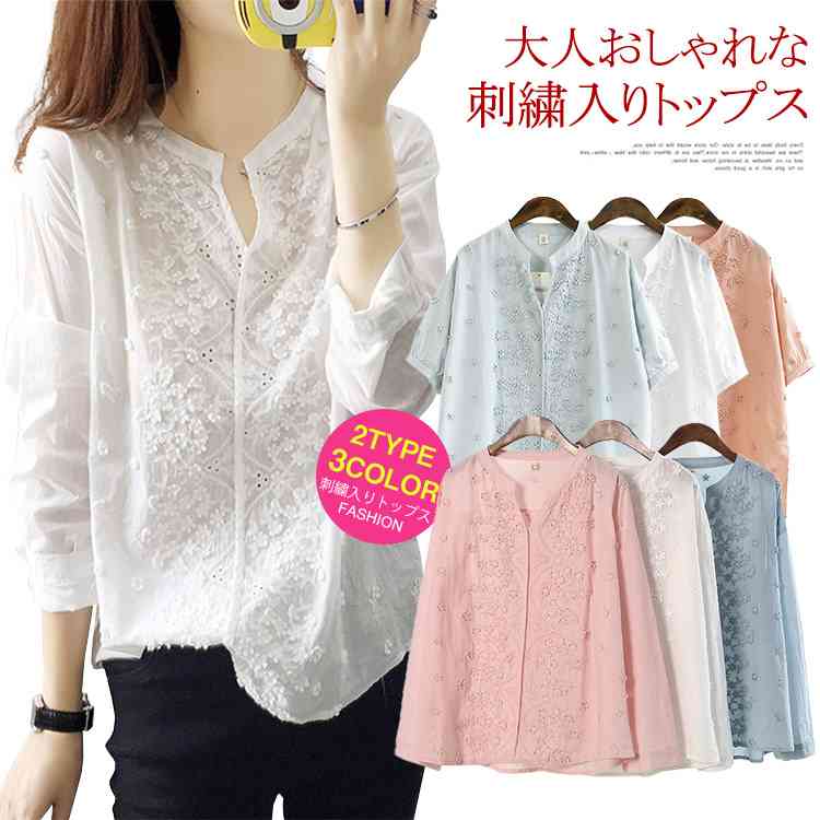 フラワー刺繍モチーフが大人可愛い。レディースブラウス フラワー刺繍ブラウス Vネック スキッパーシャツ シャツ ブラウス 長袖 半袖 コットン 花柄