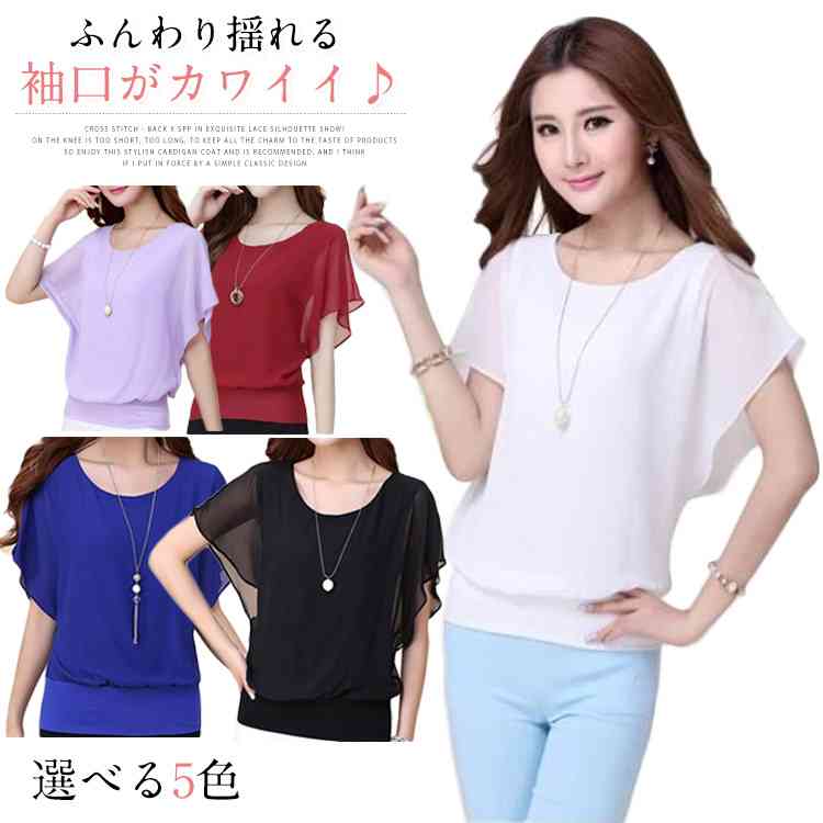 全5色 シフォントップス ドルマン シフォン ブラウス ドルマンスリーブ チュニック tシャツ 半袖 体型カバー ふんわり 春 夏 レディース