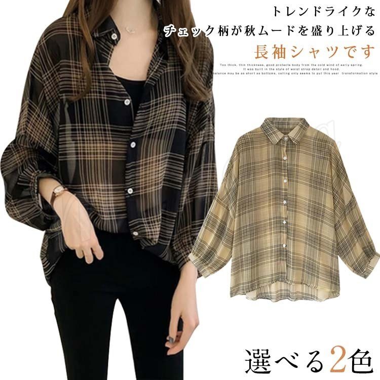 シフォンシャツ レデースシャツ 長袖 チェックシャツ ブラウ