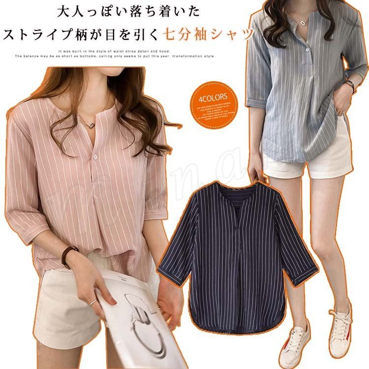 ストライプシャツ レデースシャツ 七分袖 ブラウス トップス