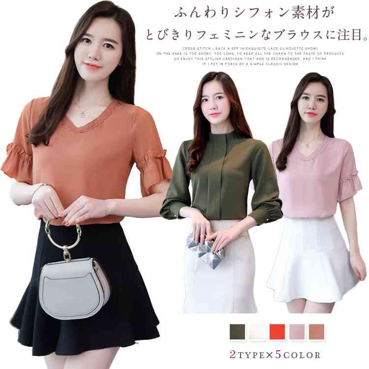 シフォンブラウス スタンドカラー トップス 5分袖 レディース シャツ ブラウス シフォン シャツ プルオーバー シンプル 無地 通勤 長袖 春 夏