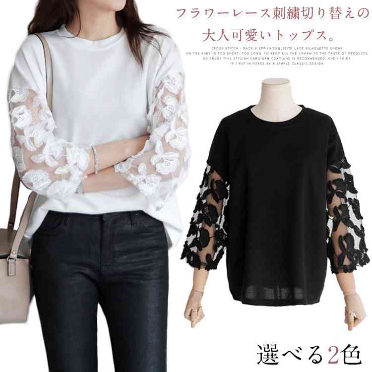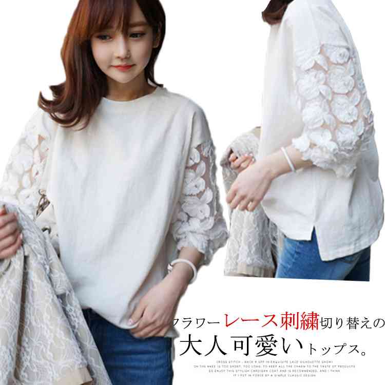 Tシャツ カットソー 七分袖 トップス 刺繍レース 切り替え レディース ラウンドネック フラワーレース 花柄 刺繍 レース 白 ホワイト 春 夏 大