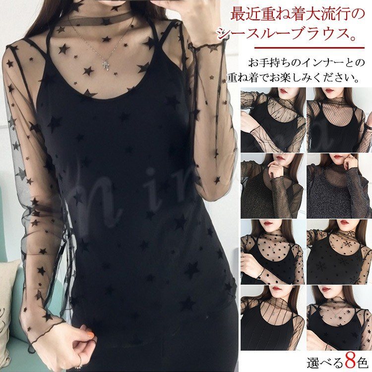 送料無料【】シースルーで女性美up!単品 ブラウス 透け インナー レース シースルー シースルーブラウス 長袖 セクシー 大人 可愛い 星柄 ドット