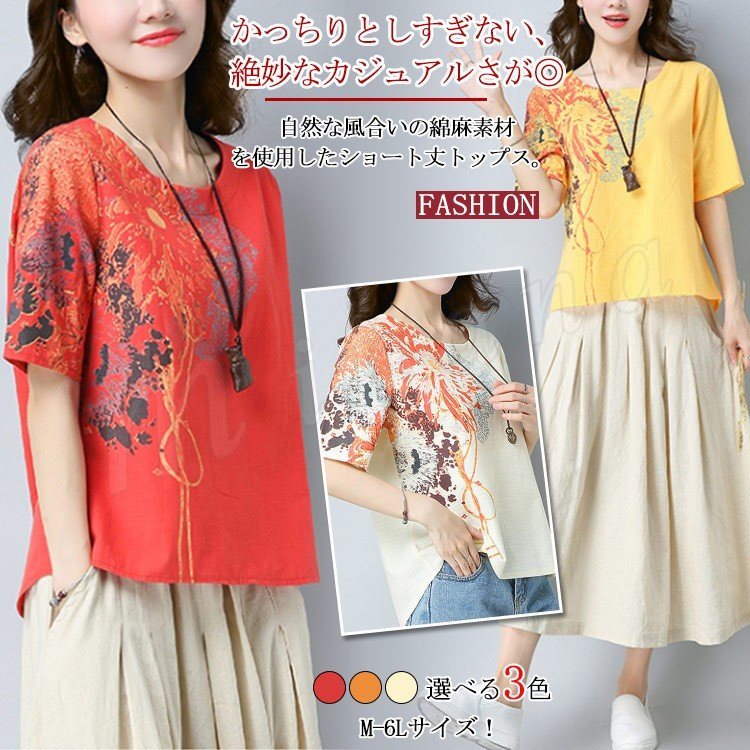【】M-6Lサイズ!綿麻トップス レディース リネン トップス tシャツ ブラウス 半袖 プリントtシャツ エスニック風 ショート丈 大きサイ
