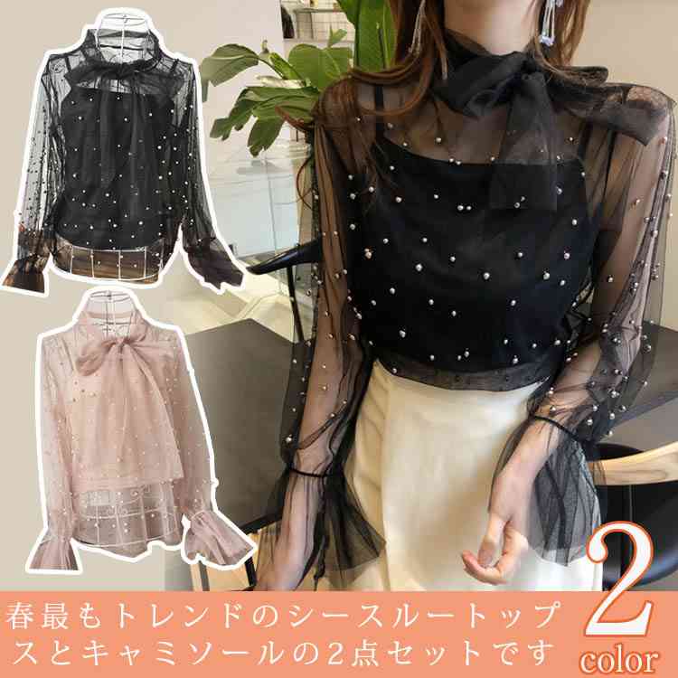 ブラウス キャミソール+チュールTシャツ 2点セット セットアップ ビジュー付き トップス レディース 長袖 春秋 ブラウス ゆったり おしゃ