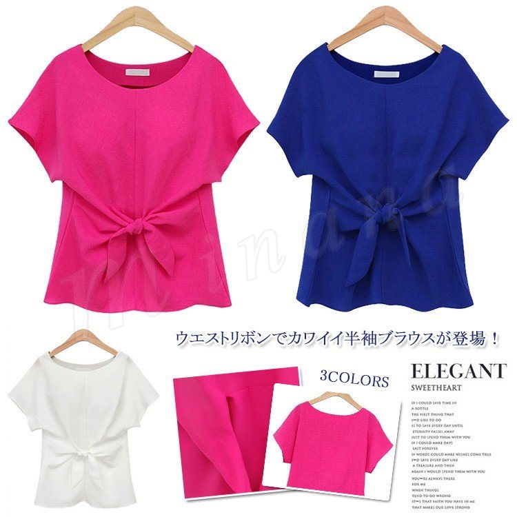 サラッと快適素材!ウエストリボン半袖ブラウス ブラウス レディース トップス プルオーバー リボン リボン シフォン 薄手 半袖 無地 大きサ