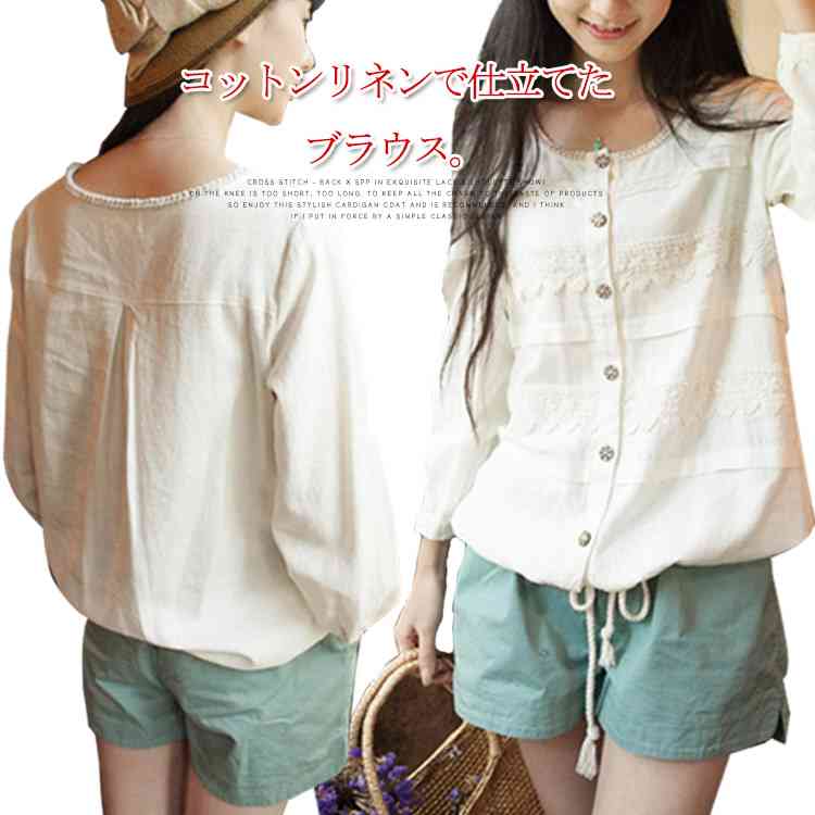 アコーデオンプリーツ加工トップス 綿麻 トップス ブラウス レディース リネントップス レーストップス カジュアル ナチュラル 可愛