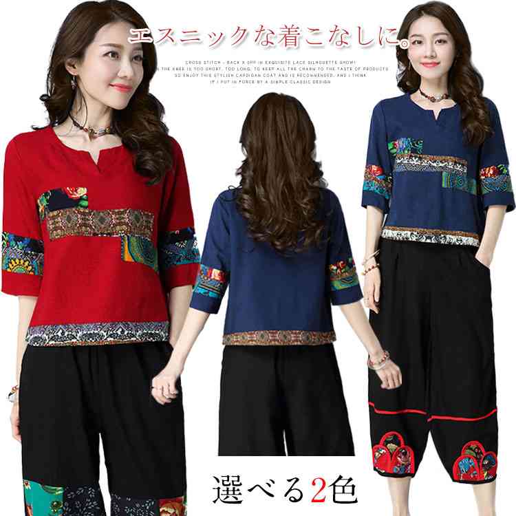 インパクト抜群なエスニック柄!トップス レディース 七分袖トップス 切り替え エスニック風 tシャツ ラウンドネック Vネック 綿麻
