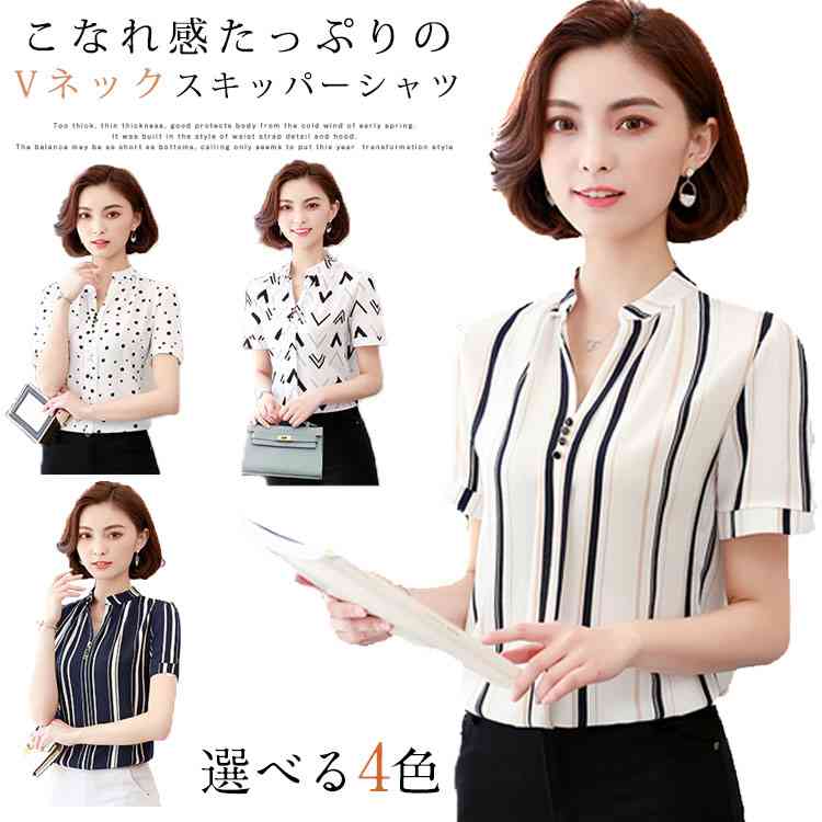 全4色×6サイズ!Vネック スキッパーブラウス レディース シャツ スキッパーシャツ 半袖シャツ シフォンシャツ とろみシャツ 半袖 ストライプ 柄