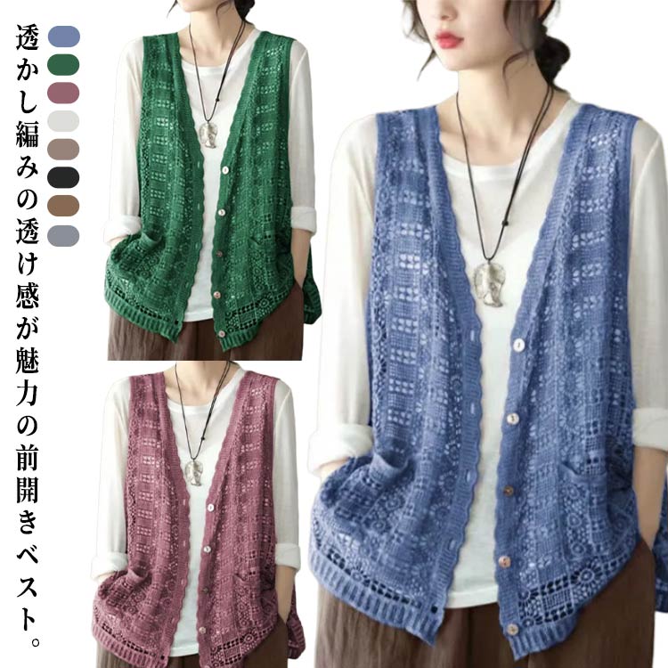 レディース ジレ ベスト トップス 透かし編み ノースリーブ 重ね着 レイヤード 前開き 薄手 春夏 ショート丈 カジュアル 編み トップス 総柄 透かし彫り 通勤 OL 可愛い 大きいサイズ カジュアル
