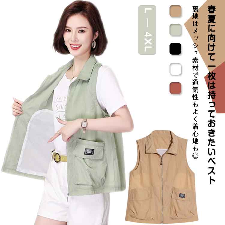 ベスト レディース スタンドカラー ジップアップ 前開きベスト ノースリーブ ジャケット 春夏 薄手 カジュアル ミリタリーベスト 裏メッシュ ポケット付き 大人 サマージャケット カジュアル アウトドア 無地 送料無料