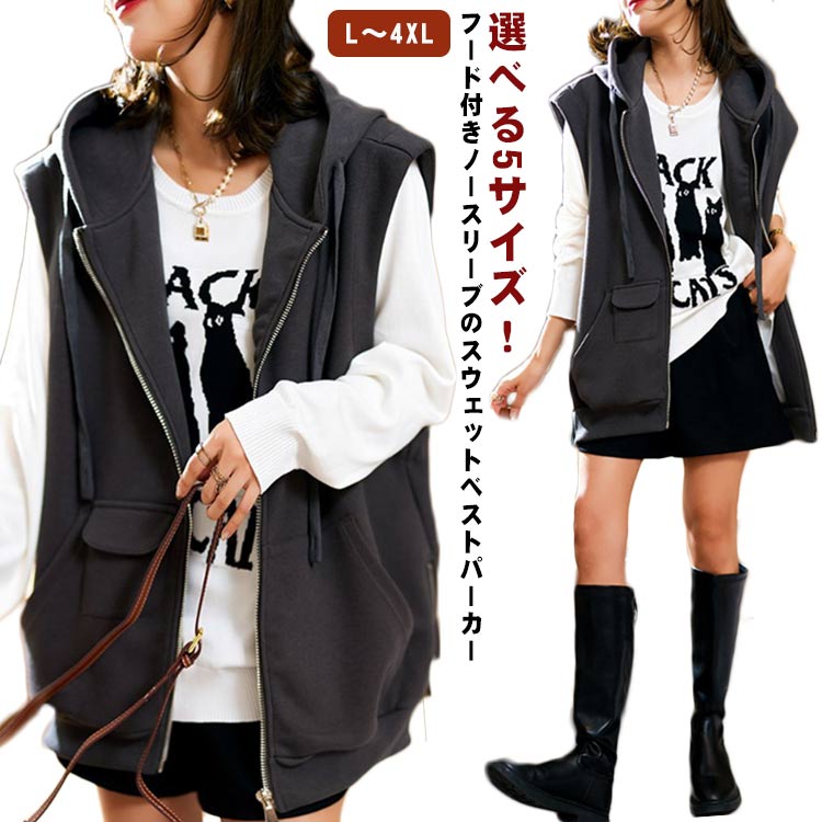 送料無料 ベスト パーカー レディース 春 秋 前開き トップス フード付き ジップアップ ポケット付き ノースリーブ 前開き 重ね着 レイヤード スウェット パーカーベスト カジュアル 体型カバー 無地 ゆったり