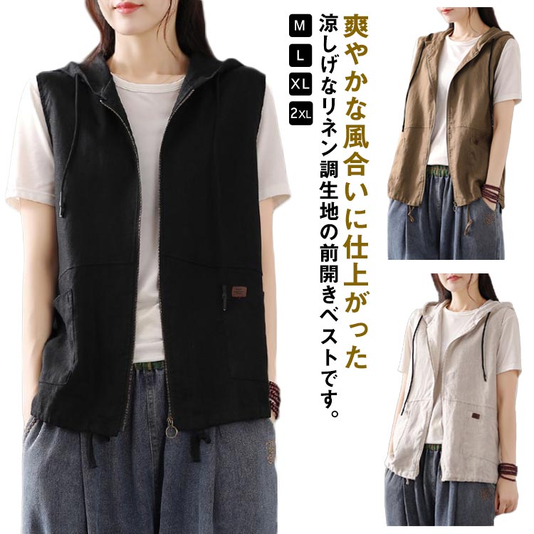 リネン調 ベスト ジップアップ 前開き 麻調 リネン風 ベスト レディース フード付き 綿麻 ベスト レイヤード 重ね着 ノースリーブ ライトアウター 羽織り トップス 薄手 無地 ポケット ナチュラル 春 夏 秋 おしゃれ 大人 カジュアル かわいい シンプル 夏服 送料無料