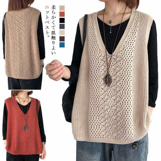 レディース ニットベスト Vネック ノースリーブ ベスト プルオーバー ケーブル編み 薄地 無地 ゆったり ミディアム丈 ストレッチ カジュアル レイヤード 重ね着 春 夏 秋 送料無料 カジュアル ニットタンクトップ レイヤード