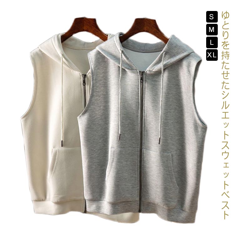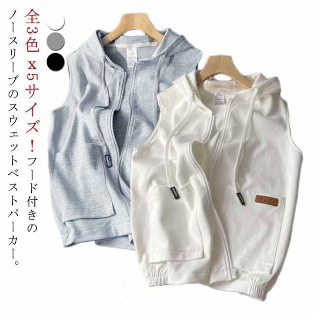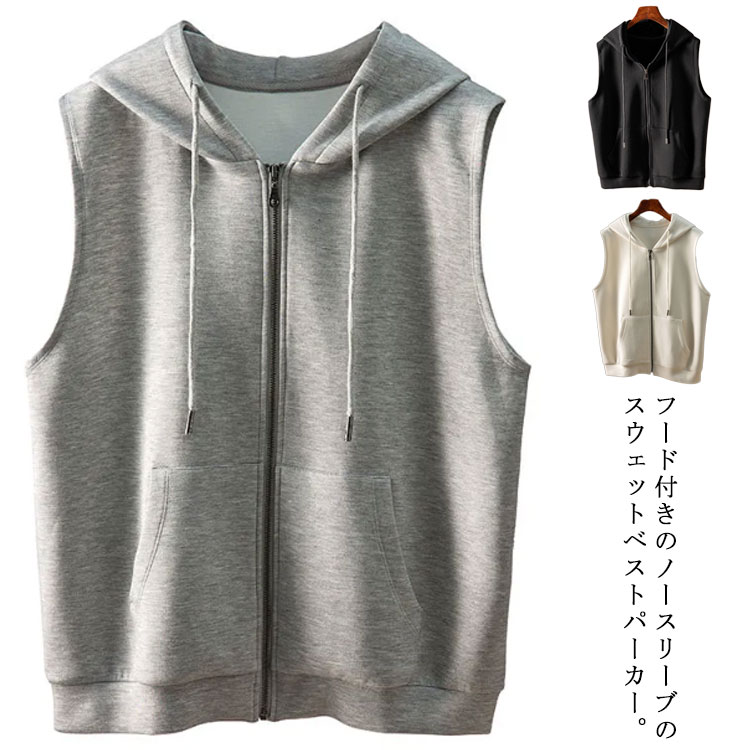 スウェット ベスト レディース スウェットベスト ノースリーブ トップス フード付き ライトアウター 綿 無地 シンプル 黒 白 グレー おしゃれ ジップアップパーカー 前開き ベスト 春アウター 羽織り ライトスエット ベスト 袖なし ゆったり 無地 レイヤード 送料無料