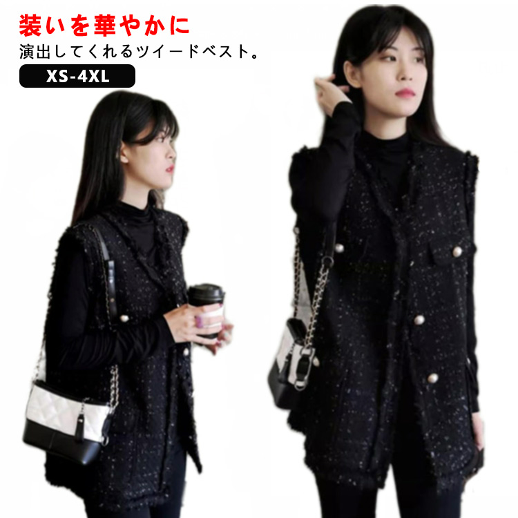 ツイードベスト レディース ツイード ジレ ジャケット Vネック トップス 春 秋 冬 きれいめ 上品 レイヤード 重ね着 かわいい おしゃれ エレガント カジュアル フェミニン ゆったり 大きいサイズ 黒 ブラック 入学式 卒業式 母親 ママ フォーマル 送料無料