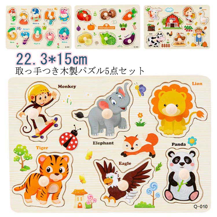 型はめパズル 5点セット 木のおもちゃ 木製パズル ベビー 子供 木のパズル 取っ手付き 立体パズル ペグパズル 知育玩具 木製玩具 知育パズル 赤ちゃん 果物 動物 数字 英語 男の子 女の子 幼児 知育おもちゃ