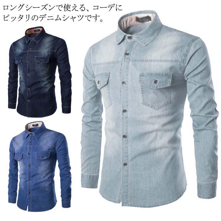 デニムシャツ メンズ 長袖 カジュアルシャツ トップス デニム ヴィンテージ加工 無地 ウエスタンシャツ お洒落 スリム 大きいサイズ 着痩せ メンズファッション