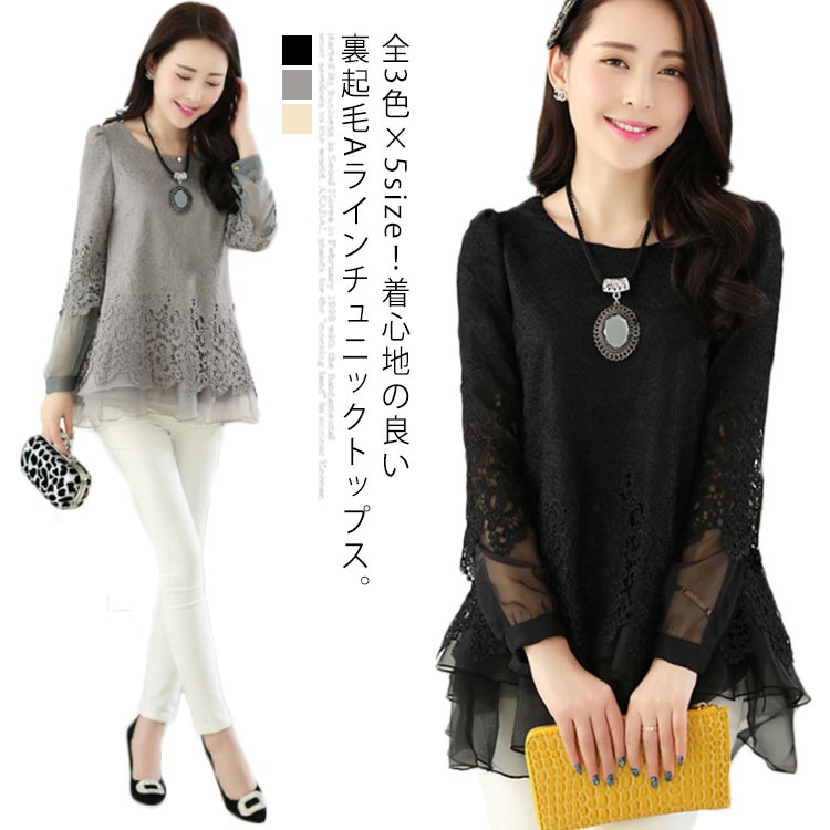 全3色×5size!Aラインチュニック レーストップス フラワーレース チュニック トップス プルオーバー 刺繍 レース 裏起毛 暖かい 秋冬 冬 大きサイズ レディース