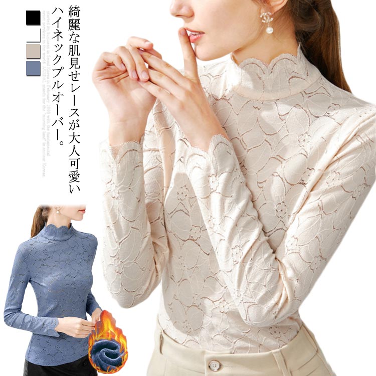 Tシャツ レディース トップス レース 長袖 インナー ハイネック ブラウス 長袖 裏起毛 着痩せ 肌見せ キレイめ ストレッチ 上品 お洒落