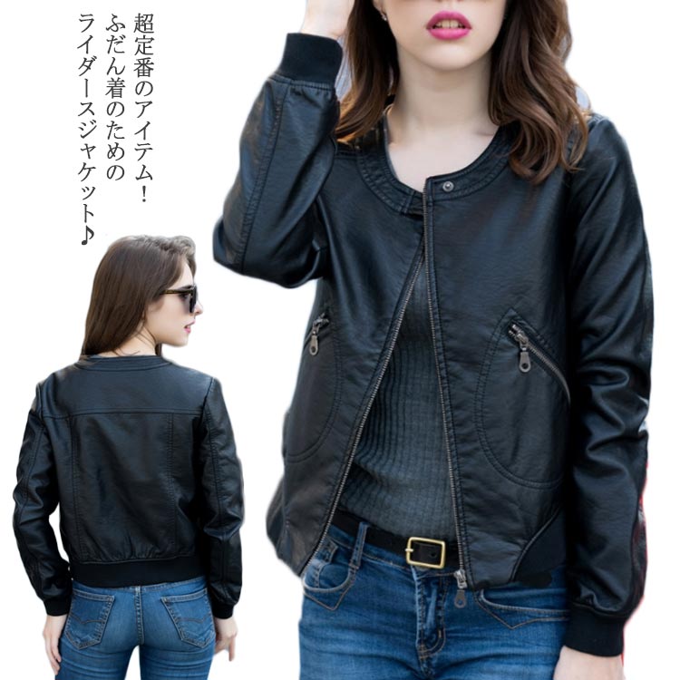 ライダースジャケット ショート丈 革ジャン レディース レザージャケット 中綿入り ブルゾン アウター ラウンドネック 体型カバー 大きいサイズ ブラック 春秋冬