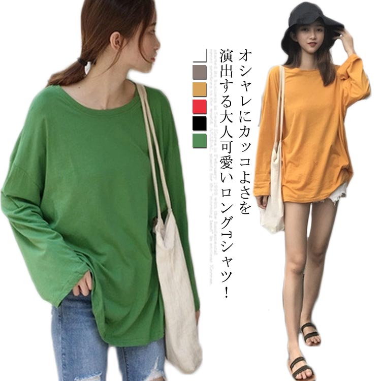 Tシャツ レディース 長袖 ロンT カットソー トップス ラウンドネック プルオーバー ロングT ゆったり 春秋 無地 体型カバー シンプル お洒落
