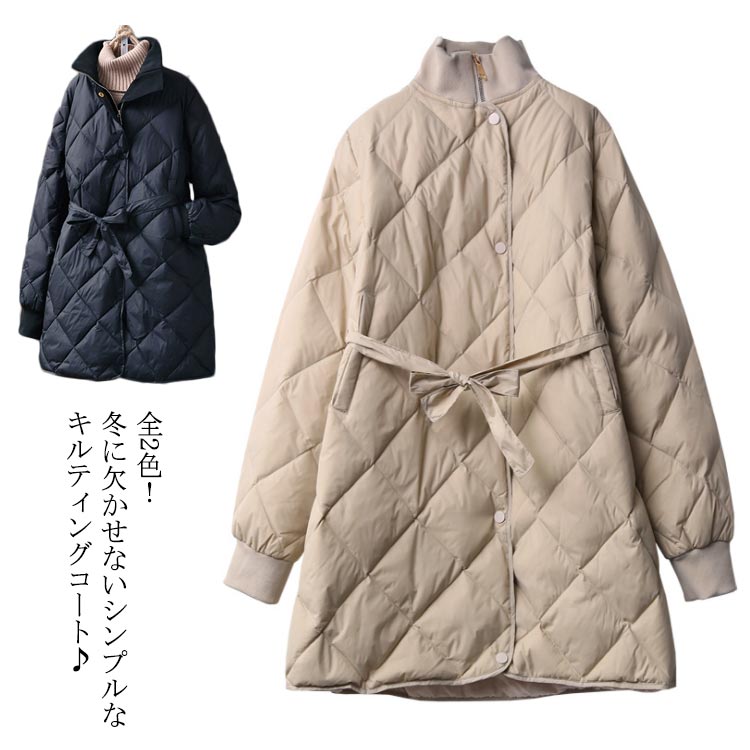 中綿コート レディース ミディアム丈 キルティング ロングコート 着痩せ ベルト付き アウター ゆったり 冬物 体型カバー 防寒 お洒落 厚手 羽織り キレイめ あったか