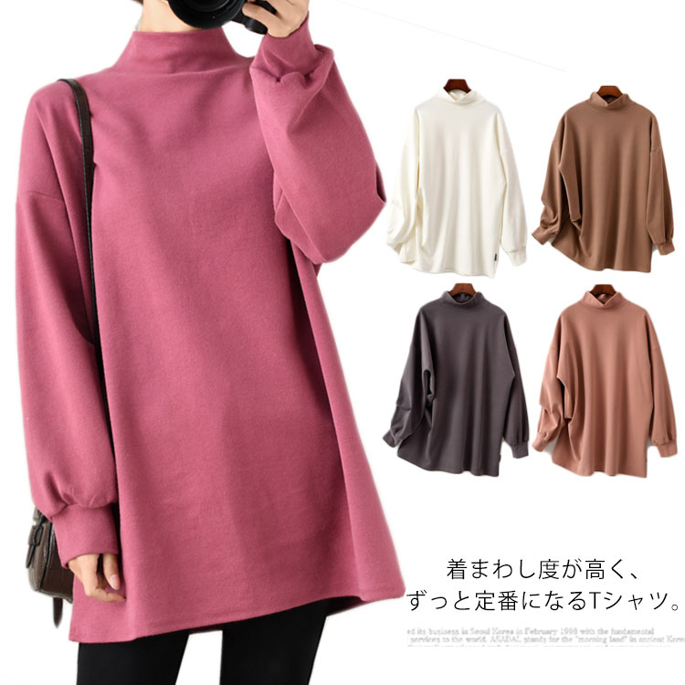 Tシャツ カットソー タイトルネック トップス ブルオーバー ロング丈 レディース 長袖 シンプル カラバリ 無地 秋冬物 厚手 お洒落 体型カバー 厚手