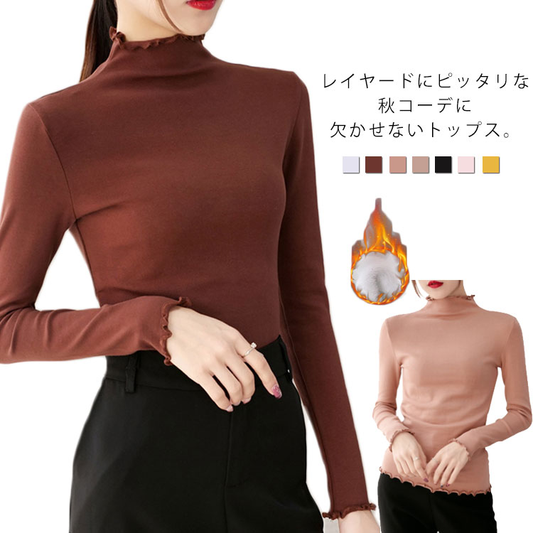 Tシャツ トップス カットソー ハイネック 長袖 無地 フリル レディース 裏起毛 秋冬 インナー 大きいサイズ シンプル キレイめ お洒落