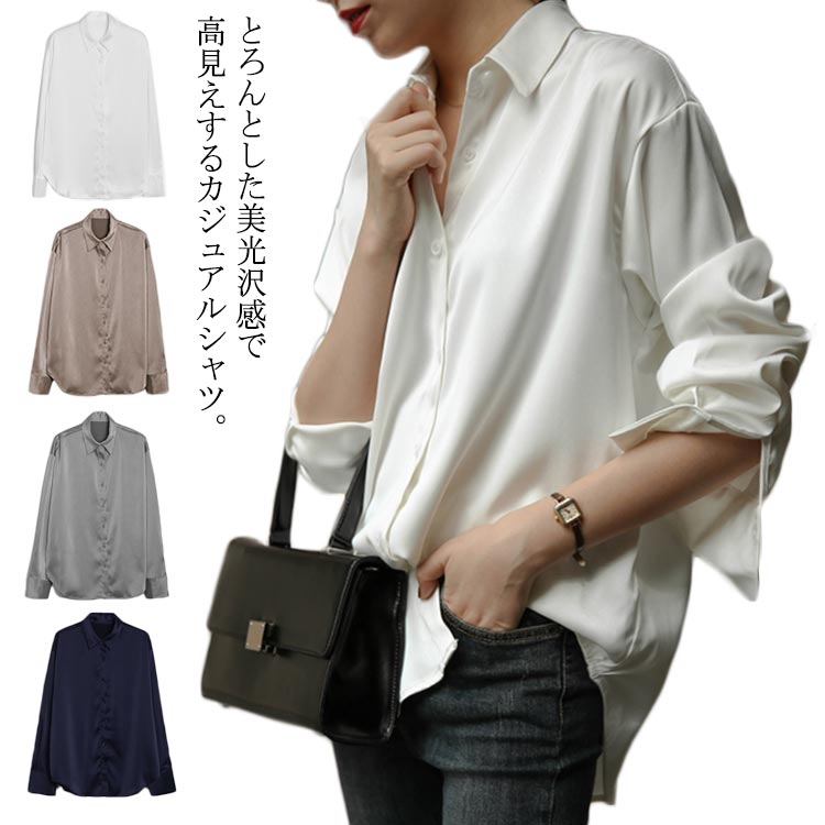 ブラウス レディース シャツ 無地 トップス 長袖 カジュアルシャツ 光沢感 ゆったり 上品 通勤 OL 着痩せ 春秋 体型カバー お洒落 フェミニン感