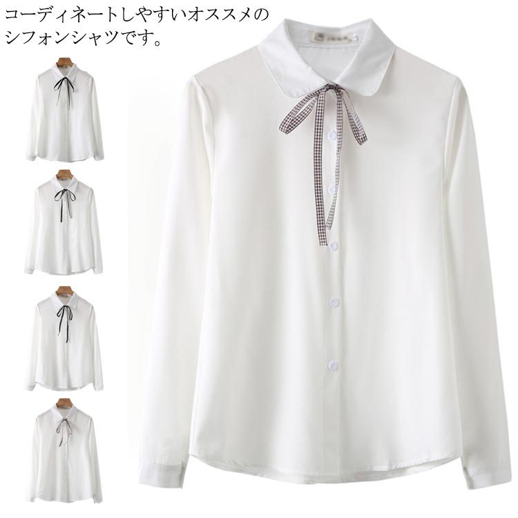 白シャツ シフォンシャツ ブラウス レディース シフォン トップス 長袖 前開き シンプル 折り襟 無地 リポン付き ゆったり 体型カバー 春秋物 通勤 通学 オフィス