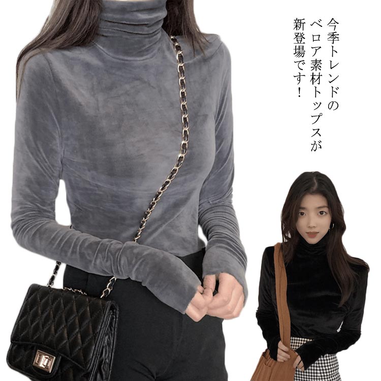 Tシャツ 長袖 カットソー ベロア レディース ハイネック トップス インナー 着痩せ 体型カバー 柔らかい 大きいサイズ お洒落 無地 秋冬