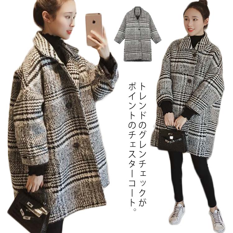 トレンド上級者に グレンチェックコート チェック グレンチェック チェスターコート ミドル丈 オーバーサイズ アウター コート 襟付き 厚手 防寒 秋冬 おしゃれ