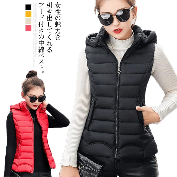 中綿ベスト レディース アウター ダウン風 ベスト フード付き ショート丈 着痩せ 細身 暖かい 防風防寒 体型カバー 大きいサイズ ゆったり 無地