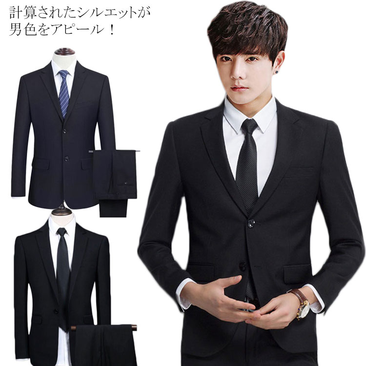 選べる2タイプ! リクルート 就活 スーツ フォーマルスーツ メンズ 結婚式 花婿 ウェディング スーツ 上下セット 2点セット ブラック ネイビー ビジネススーツ スリム 大きいサイズ ジャケット スラックス 形態安定 冠婚葬祭 演奏会 テーラードジャケット 無地 カジュアル お仕事