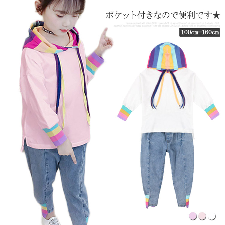 送料無料 子供服 セットアップ パーカー デニムパンツ フード付きパーカー ジーンズ ロングパンツ 無地 長袖 リブ編み ポケット付き 切り替え 伸縮性 お洒落 キレイめ ガールズ キッズ ジュニア 秋新作