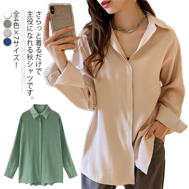 《送料無料》全4色×7サイズ!秋服 シャツ ブラウス レディース ロングスリーブ 無地シャツ 開襟 長袖シャツ カジュアルシャツ 大きサイズ 通勤 春 秋