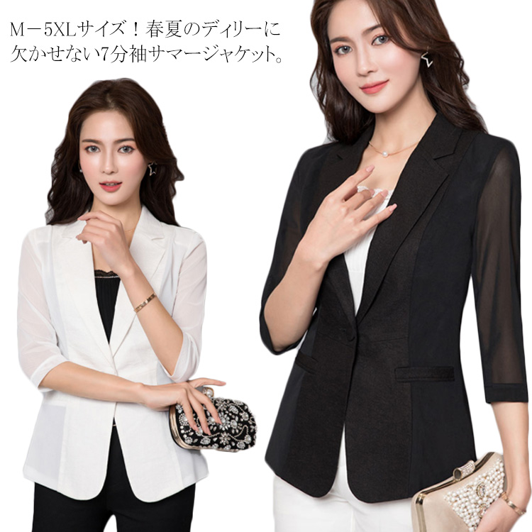M-5XLサイズ!夏ジャケット 七分袖ジャケット テーラードジャケット 七分袖 サマージャケット レディース ジャケット ライトアウター 透け袖 ホワイト ブラック サマー 大きサイズ